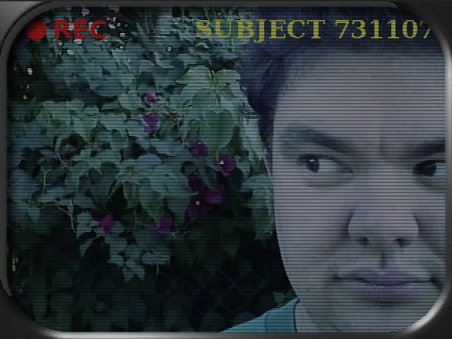 • Comments: Luke and I were really into conspiracy shows like X-Files and Nowhere Man. I thought this portrait brought out the paranoia well. I tried to heighten the claustrophobia by the general un-aesthetic placement of the face and the shift of the eyes. To further heighten the unease, I tinted the image to colder tones, then I tried to make it look like a capture from a security monitor by adding scan lines. What the heck, might as well add some monitor embelishments as well, right?