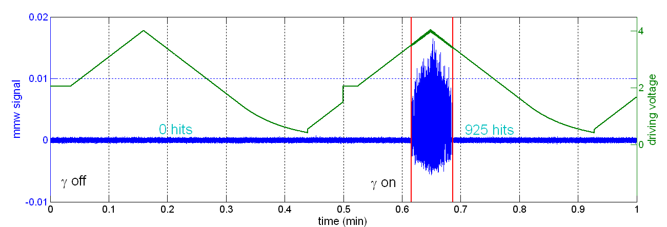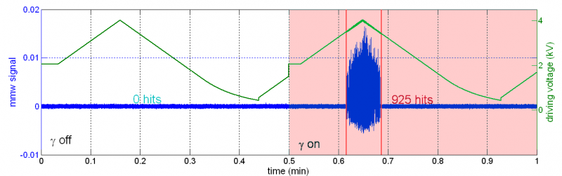 | current | 19:53, 6 March 2012 | 1,297×407 (24 KB) | Tometheus (talk | contribs) | Triangular sweep of dc power supply from 0 to 4 kV over a 30 s period (green line) and the corresponding mmW signal (blue line) without (unshaded) and with (shaded) γ-ray radiation. | |